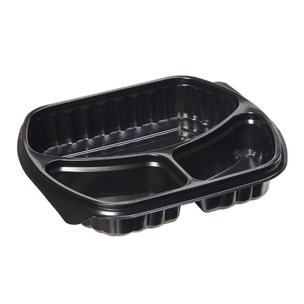 Siyah renkli alt kabının ölçüleri içten içe 17 cm eninde, 19,5 cm boyunda, 3,5 cm derinliğinde ve şeffaf renkli kapağının ölçüleri ise içten içe 15,5 cm eninde, 18 cm boyunda, 3 cm yüksekliğinde plastik, mikrodalgaya girebilen, ısıya dayanıklı, tek kullanımlık 3 bölmeli sıcak servis setidir.